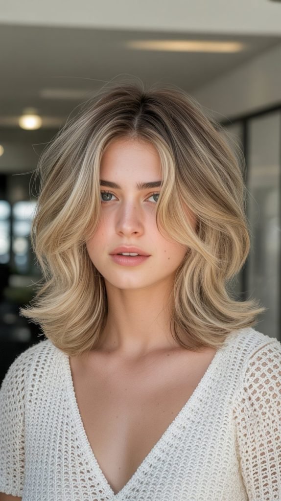 A buttery blonde balayage enhances the choppy layers of a shag haircut, creating soft, creamy tones that feel effortlessly cool. This approach delivers a lived-in aesthetic that’s both relaxed and refined.