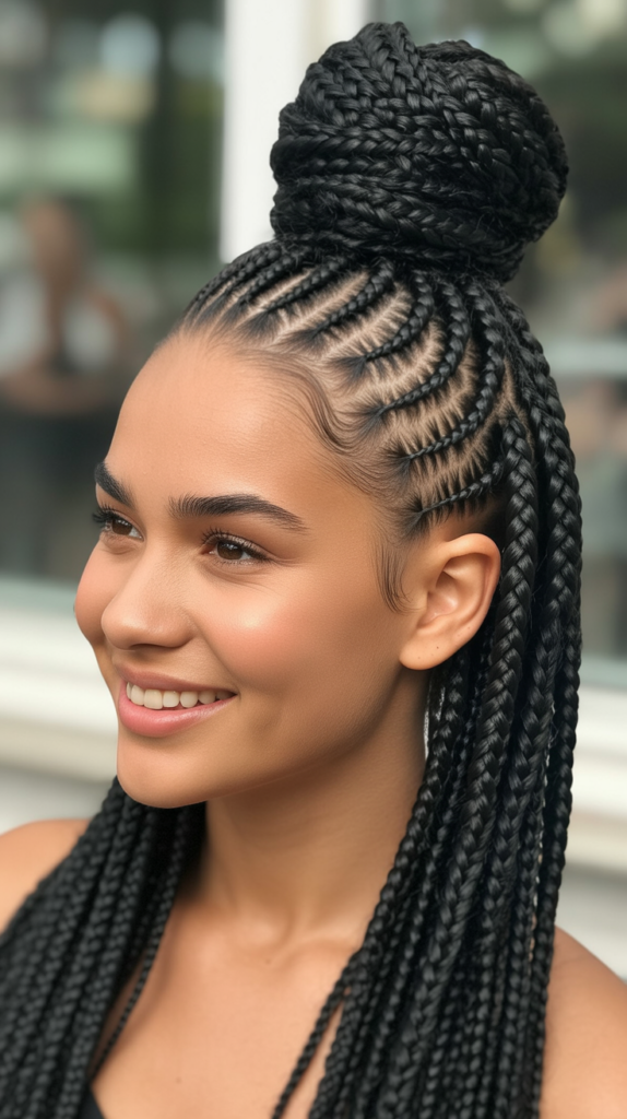 The braids are woven into a neat bun that sits at the top, middle, or back of the head, depending on the desired aesthetic.