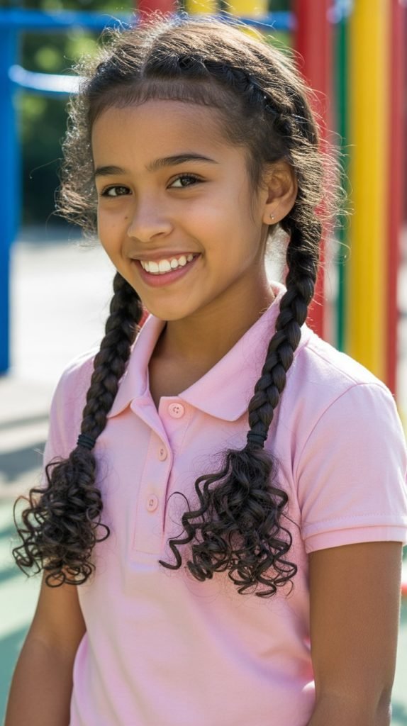 - The contrast between the structured, braided crown and the free-flowing curls creates visual interest and dimension that’s both practical and beautiful for school settings.