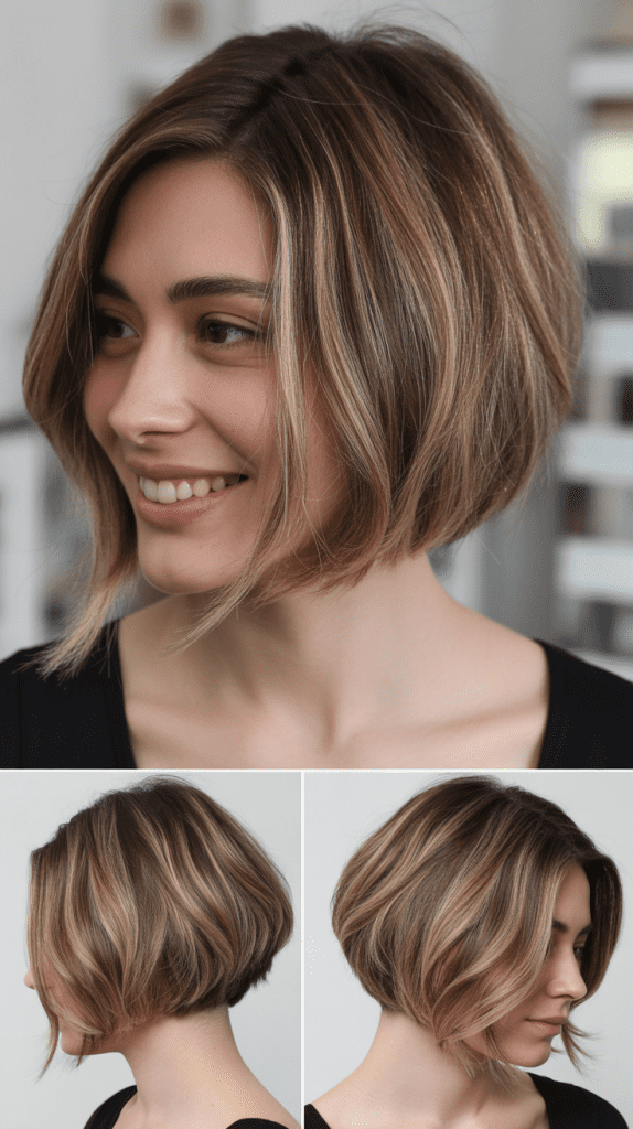 The angled bob features shorter hair at the nape that gradually lengthens toward the front, creating a dynamic diagonal line that adds sophistication and perceived volume.