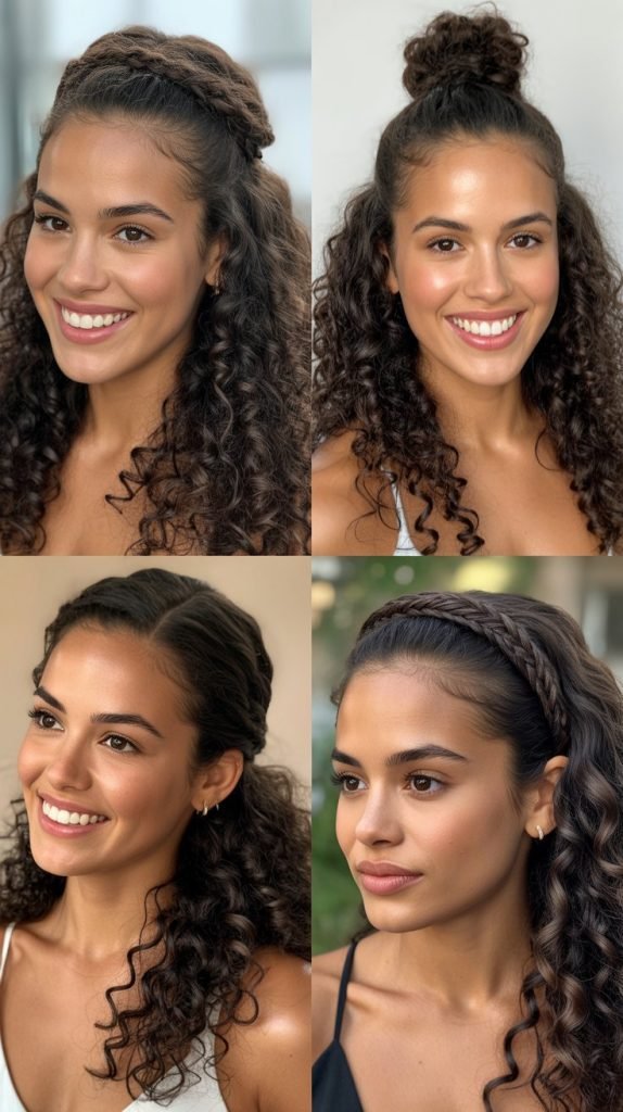 This style features a delicate braid across the crown that keeps hair away from your face while allowing the majority of your curls to cascade freely, combining structure with natural flow.